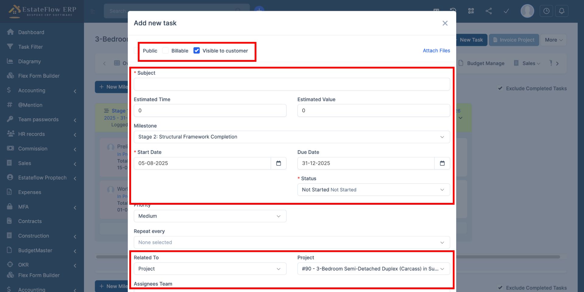 Milestones represent major phases or deliverables within a project. In real estate development projects, milestones often reflect stages such as Foundation Works, Superstructure, Roofing, Finishing, and Handover. Creating milestones ensures that tasks are aligned with key project phases.
