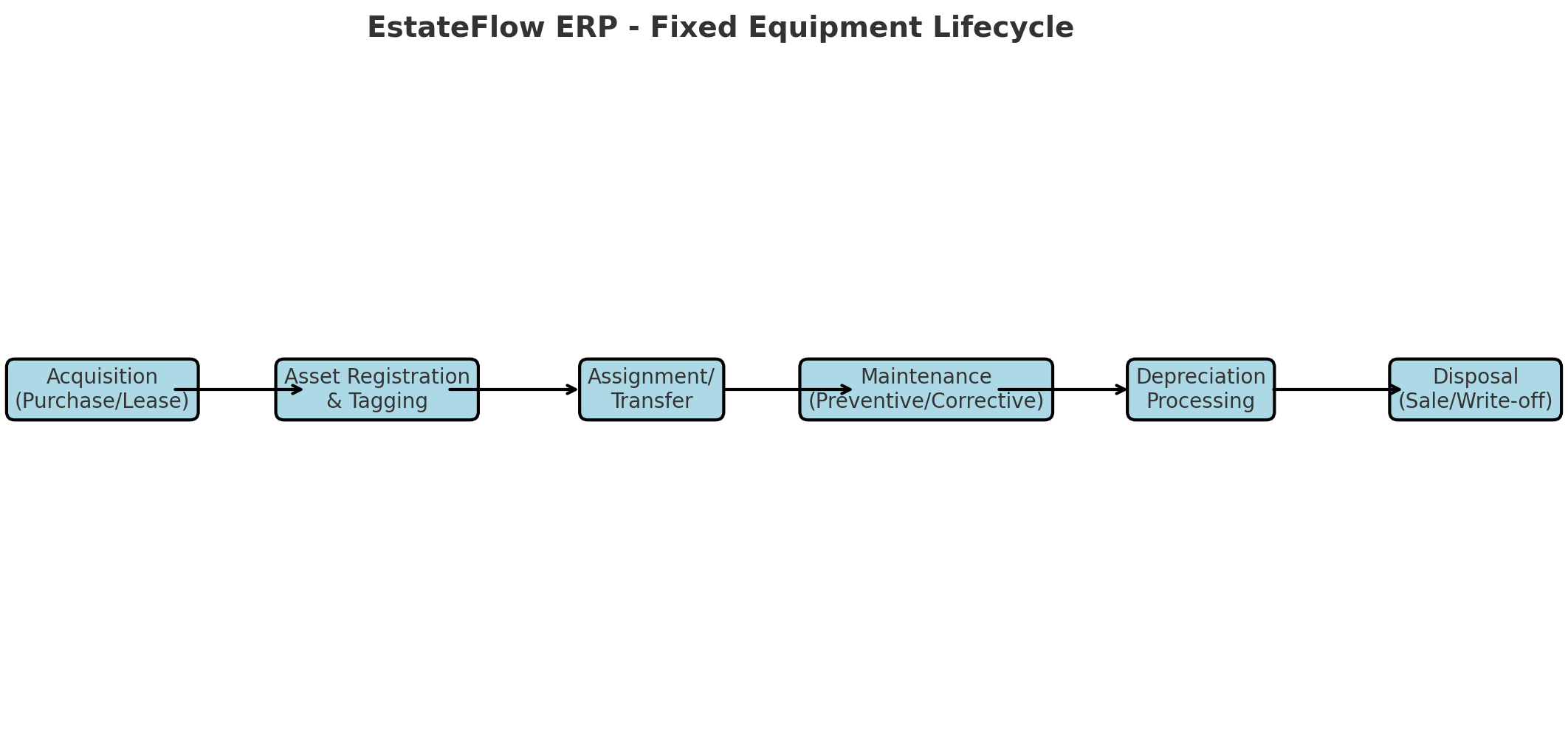 The AssetTrack Pro (Fixed Equipment Management) module in EstateFlow ERP is designed to manage, track, and maintain an organization’s fixed equipment, including construction machinery, motor vehicles, trailers, batching plants, and other operational tools. It enables real estate developers, contractors, and asset managers to control the entire equipment lifecycle — from acquisition, assignment, and maintenance to depreciation and disposal.